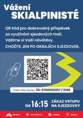 Když upravené sjezdovky na Bílé pro skialpový pohyb využijete, odměňte ty, kteří vám to umožní, rozumnou dobrovolnou odměnou. Až budou sjezdovky použitelné, objeví se tam banner s číslem účtu i QR kód pro superjednoduchou platbu.